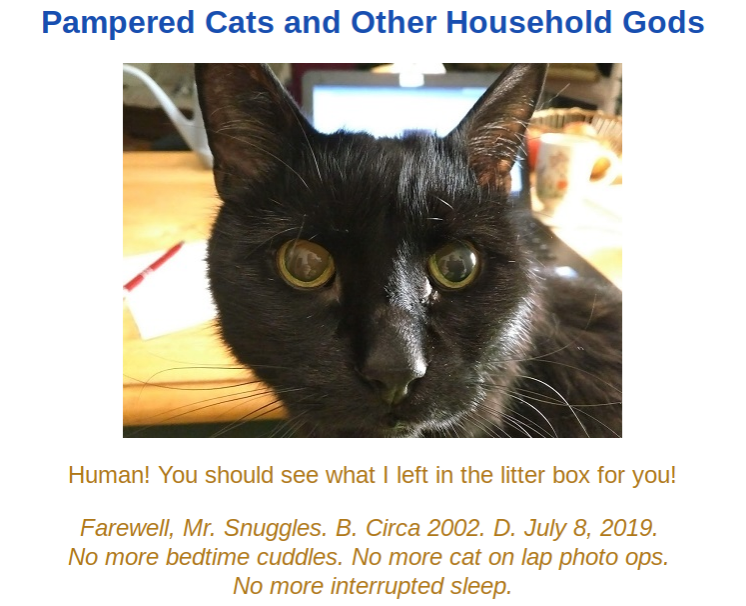 A couple of weeks ago, I had to say farewell to one old cat whose health was waning, especially after a heat wave in early July.