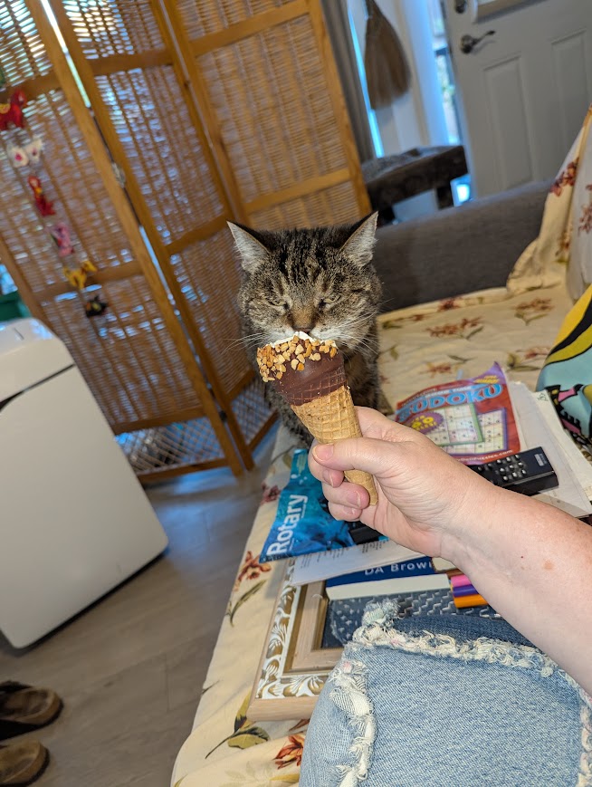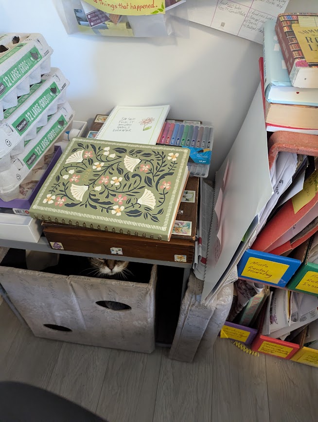 Sometimes, when I am planted in the wee corner office at my laptop, the old Tabby Cat likes to observe and supervise me from her various perches or hiding places. Her timing is impeccable during Zoom meetings, mewing loudly and demanding attention.